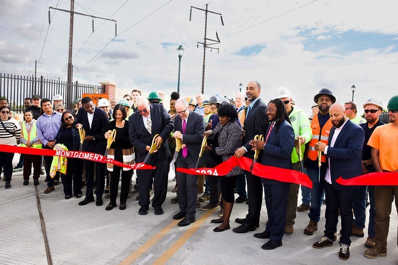 Most Americans probably do not realize that many of the recent road and bridge projects in their communities received IIJA funding. For example in October 2023, the new Second Avenue Bridge in Detroit, Michigan opened for operation and was constructed using funds from the IIJA (Video 2.1). The bridge has an innovative design that avoided the need to lower the freeway beneath it. It was constructed off-site and then moved on-site to be installed starting in July 2022. As another example, reconstruction of the Montgomery Avenue Bridge in Philadelphia was completed in September 2024 (Image 2.4). A $17 million contract for this project was awarded in 2021, and 80% of this cost was funded by the IIJA.